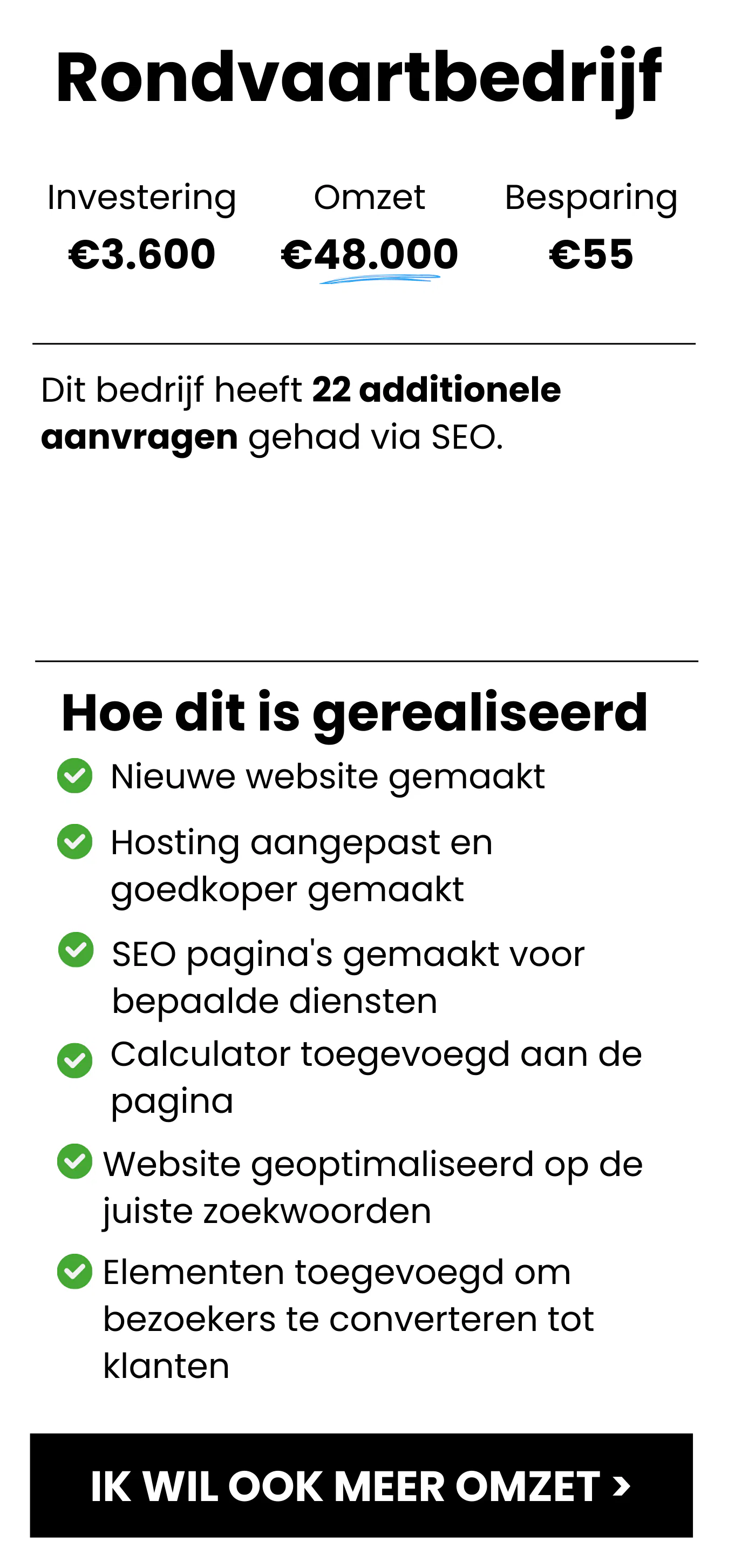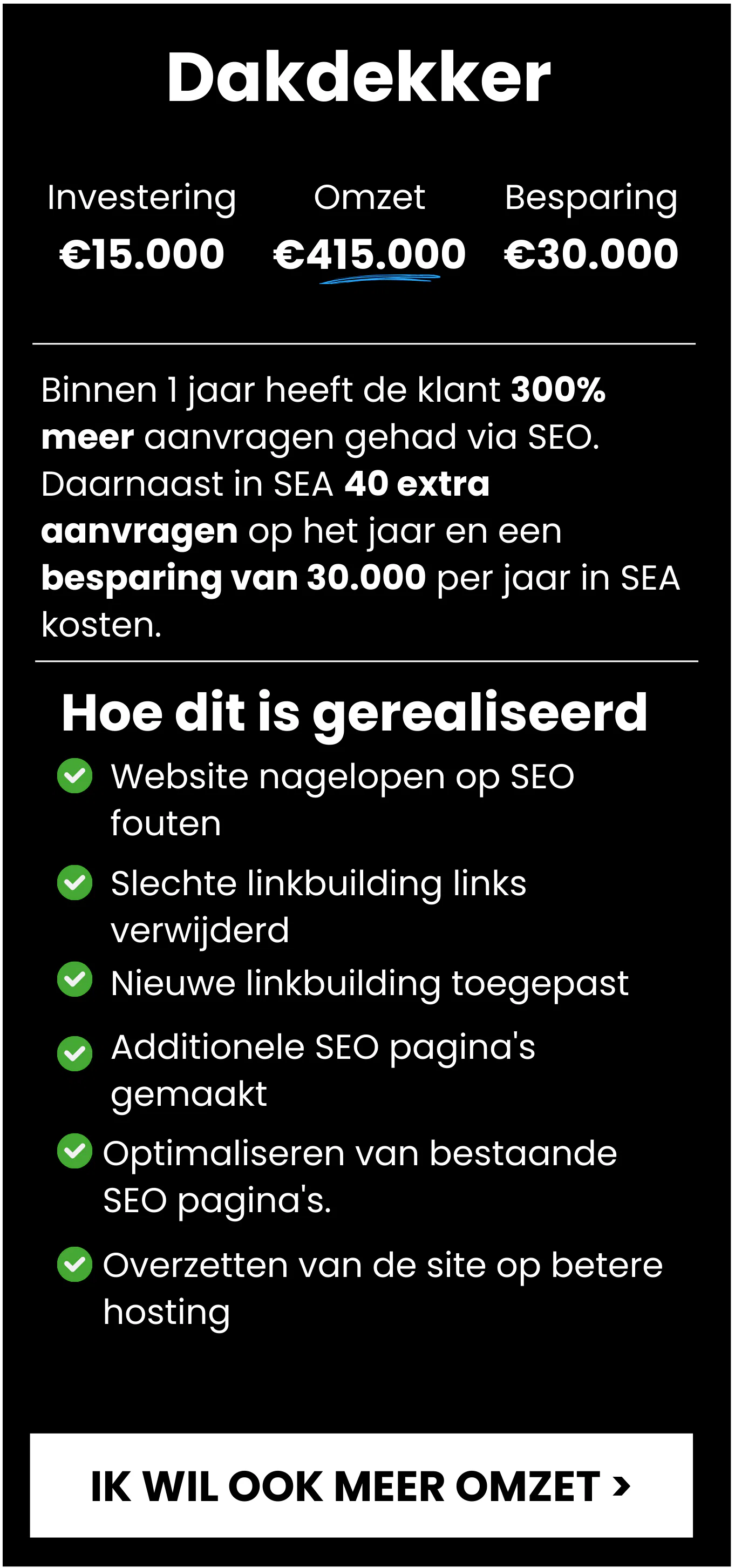 Een veel voorkomend doel bij onze klanten is om direct resultaat te combineren met een lange termijn visie. Door Zowel SEO als SEA in te zetten komen er direct nieuwe klanten. Wij rekenen mee of de investering rendabel is en meten wanneer de kosten van SEA terug kunnen omdat de investering in SEO meer resultaat levert.